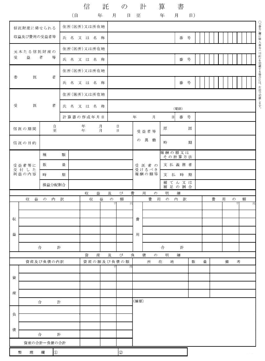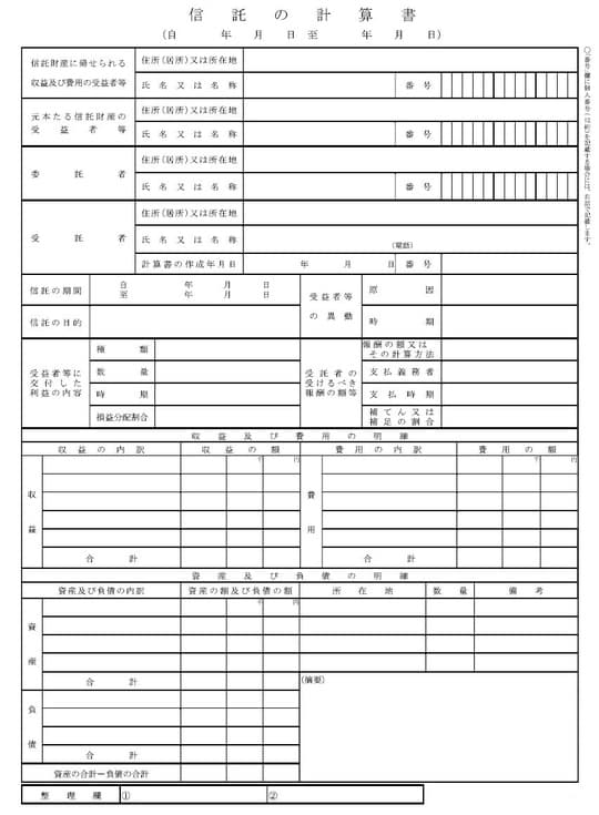 信託期間中に税務署に提出する書類を「信託の計算書」と「信託の合計表」といい、毎年1月1日から12月31日までの収益と費用の明細、資産と負債の明細を記載して、翌年1月31日までに所轄税務署に提出します。なお、受益者である一郎、二郎、三郎は、この「信託の計算書」をもとに、所得税の確定申告をします。