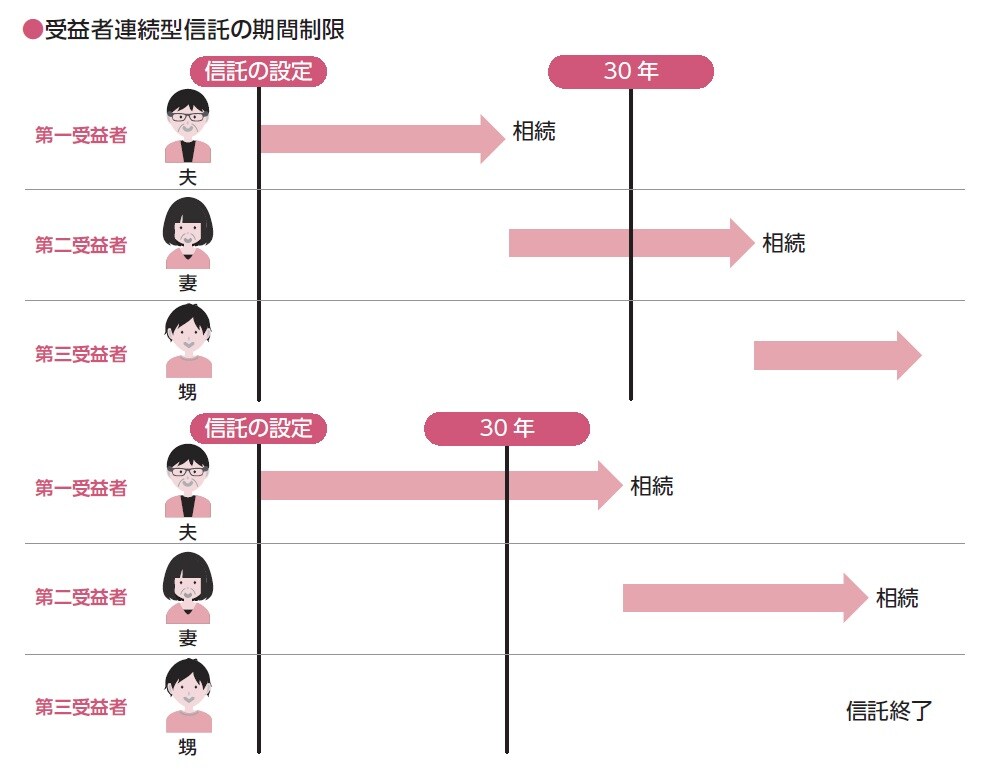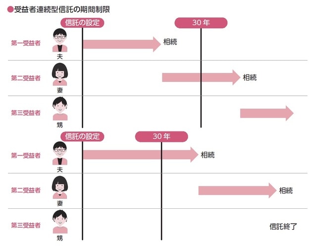 信託契約では、信託契約を締結したときから30年を経過したときの受益者に相続が発生した場合、その次の受益者に相続が発生したときに信託は終了します。