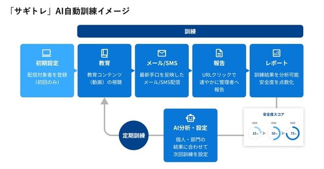 ユーザー企業の従業員は、「サギトレ」のシステム上で詐欺の手口や注意すべきポイントを学ぶ教育コンテンツを視聴し、その後、実際の業務環境の中で疑似的な詐欺メール・SMSを受信します。AIがその対応結果を分析し、個人や部門ごとのリスク傾向を可視化。分析結果に基づき、最適な訓練内容や配信スケジュールを自動で設定します。