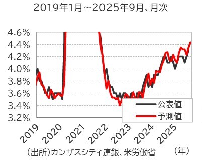 カンザスシティ連銀が独自に作成している労働市場情勢指数(LMCI)の代替版(政府閉鎖によって得られないデータを補ったもの)から予測される9月の失業率は4.4%と8月の4.3%から上昇し(図表2)、同月の非農業部門雇用者数は前月差+5.8万人と低水準になっています(図表3)。