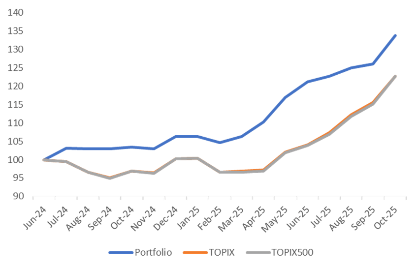 そんな「たられば」をいくらいっても仕方ないので、11月からは時価ウエイトをベースとした独自ウエイトの運用に切り替えることにした(前回記事で説明済)。ベンチマークもTOPIXに変更する。図表1や図表5から明らかなようにTOPIXとTOPIX500 ではほとんど差がない。