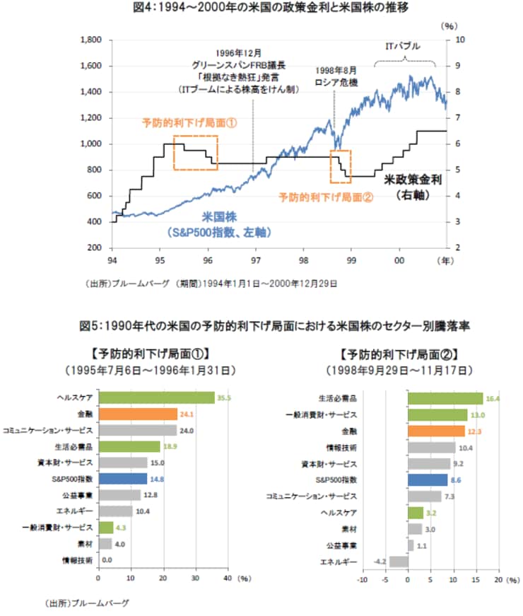 実際、1990年代後半の予防的利下げ局面を振り返ってみても、米国株は総じて底堅い推移となりました(図4)。特に、過去の予防的利下げの局面では、金融、消費関連、ヘルスケアなどのセクターが株価上昇を主導する傾向がみられました(図5)。足元ではハイテク株を中心に米国株の割高感が高まりつつある中、今後はセクターや投資スタイルの分散の観点から、米国高配当株への投資が見直される可能性もありそうです(図3)。