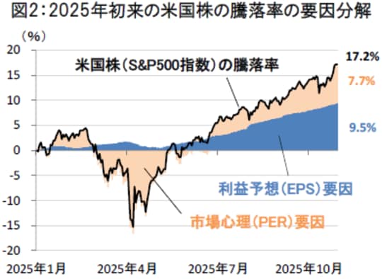 2025年初来の米国株の騰落率を要因分解してみると、堅調な利益予想の上方修正によって株高のトレンドが正当化されてきたことが分かります(図2)。加えて、足元ではFRBの利下げへの期待やトランプ関税をめぐる不透明感の後退などを背景に、投資家心理の改善が株価の上昇を後押しする傾向がみられます。