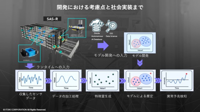 一方で、自動化・省人化が急速に進む物流現場において、突発的な設備停止による生産や計画への影響はいまだ大きなリスクです。こうした課題に応えるため、日本オラクルの「Oracle Autonomous AI Database」と「OCI Data Science」を基盤に、稼働状況の可視化や、稼働データの解析によって故障の兆候を検知し、ダウンタイムの発生を軽減しつつ計画的なメンテナンスを実現できる「予知保全システム」を開発。現場に行かずに遠隔で状況把握・復旧を支援できる「リモートメンテナンス」と一体の保守サービス「ITOKIアドバンスドメンテナンス」を開発しました。