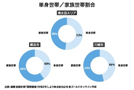 以下は、2020年の国勢調査における南太田エリアにおける単身世帯・家族世帯の割合を示したグラフです。