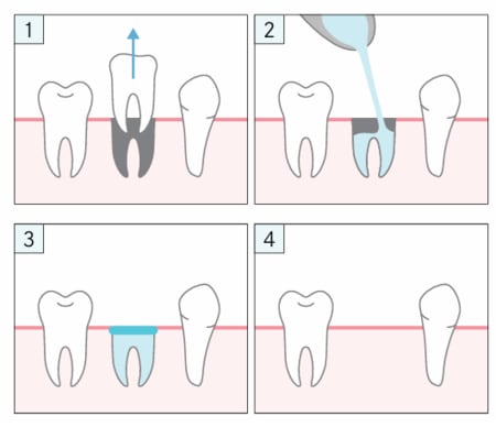 手順の概要は、抜歯窩か (抜歯後の穴)の清掃(炎症がある場合は、その部分を丁寧に取 り除き、骨の表面を清潔に整える)、補填材の充填(骨を補うための材料を穴に詰める。 この補填材はさまざまな種類があり、使用する材料は術者によって異なる)の2ステップ です。そして、補填材がある程度硬化した段階で、インプラントを埋め込みます。