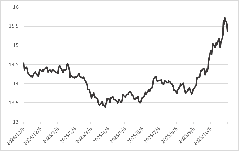日本株相場もさすがに過熱感が指摘されている。とくに日経平均は一部の銘柄への偏りが顕著でいびつな構造となっている。10月末はアドバンテスト(6857)1銘柄で日経平均を1,000円も押し上げた日があった。10月の日経平均株価は月間で7,478円(17%)高となったが、アドバンテスト、ソフトバンクグループ(9984)、東京エレクトロン(8035)、ファーストリテイリング(9983)の4銘柄だけで、日経平均を12%(5,700円)以上押し上げた計算だ。
