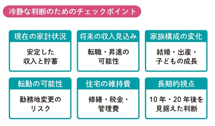 「もったいない」かどうかの判断は単純ではありません。現在の家計状況、将来の収入見込み、家族構成の変化、転勤の可能性など、ライフプラン全体を総合的に検討する必要があります。一時の感情ではなく、長期的な視点で冷静に判断しましょう。