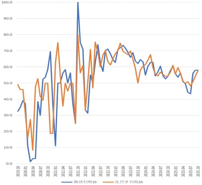 現状判断DI(季節調整値)は49.1と9月から2.0ポイント上昇し、5月から6ヵ月連続で上昇しました。24年3月の49.8以来19ヵ月ぶりの水準に。6ヵ月連続の上昇は現在の季節調整値でみて20年5月~10月の新型コロナウイルスによる急激な落ち込みからの持ち直し局面以来5年ぶりです。
