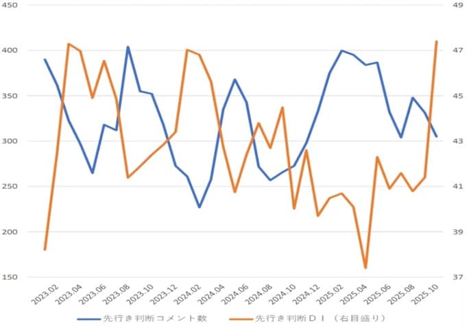 10月の「価格or物価」関連先行き判断DIは、47.4と23年3月の47.3を上回る水準まで上昇しました。今年4月の37.4からは10.0ポイント改善。コメント数は305名で、2ヵ月連続減少しています。