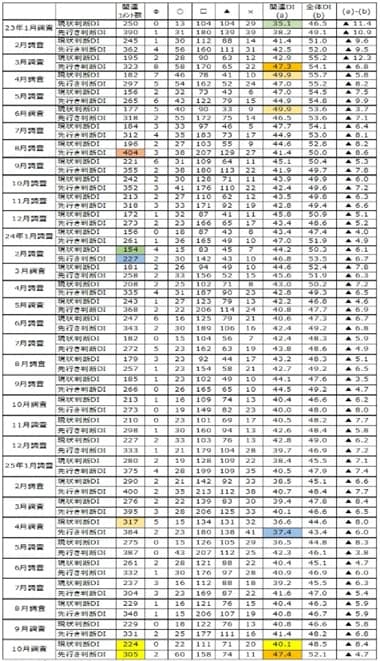 10月調査で「実質賃金」関連判断DIは2ヵ月連続で現状、先行きとも50割れになりました。2025年の実質賃金・前年同月比が確報値でみてマイナスになったことと整合的な感じがします。10月「最低賃金」関連判断DIは4ヵ月連続で現状、先行き判断とも50割れとなりました。