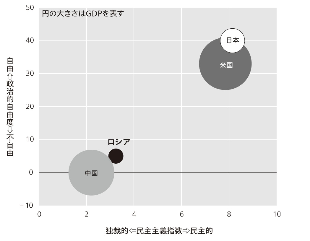 しかし、ロシアでは政敵を排除する動きが頻発し、現政権に有利な方向に世論を誘導する工作も多く見られるため、政治的自由度も民主主義度も極めて低いレベルにあります(図表2)。そして結果的に中国に極めて近い政治状況となっています。