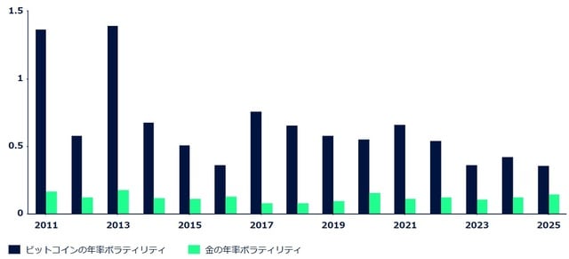 ビットコインのボラティリティは、ここ数年で正常化し始めたものの、一貫して株式や金の数倍で推移しています。この高水準のボラティリティは、極めて大幅な利益を生み出す可能性がありますが、同時に、このようにボラティリティが高いゆえに、ビットコインは多くの投資家にとって組み入れがたい資産となっています。金はポートフォリオに極めて高い安定性を提供してきました。そして、たとえ小幅なアロケーションでも、ビットコインの潜在的リターン余地を残しつつ、ポートフォリオ・リスクを相殺できます。