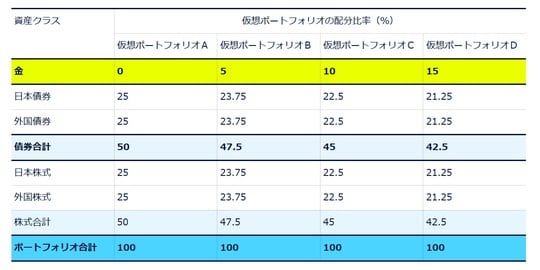 金を除いた基本の仮想ポートフォリオとして、国内債券、外国債券、国内株式、外国株式にそれぞれ25%ずつ配分(ポートフォリオA)。そこから金を5%(ポートフォリオB)、10%(ポートフォリオC)、15%(ポートフォリオD)と加え、各資産の割り当てを均等に減らしたケースを検証しました。