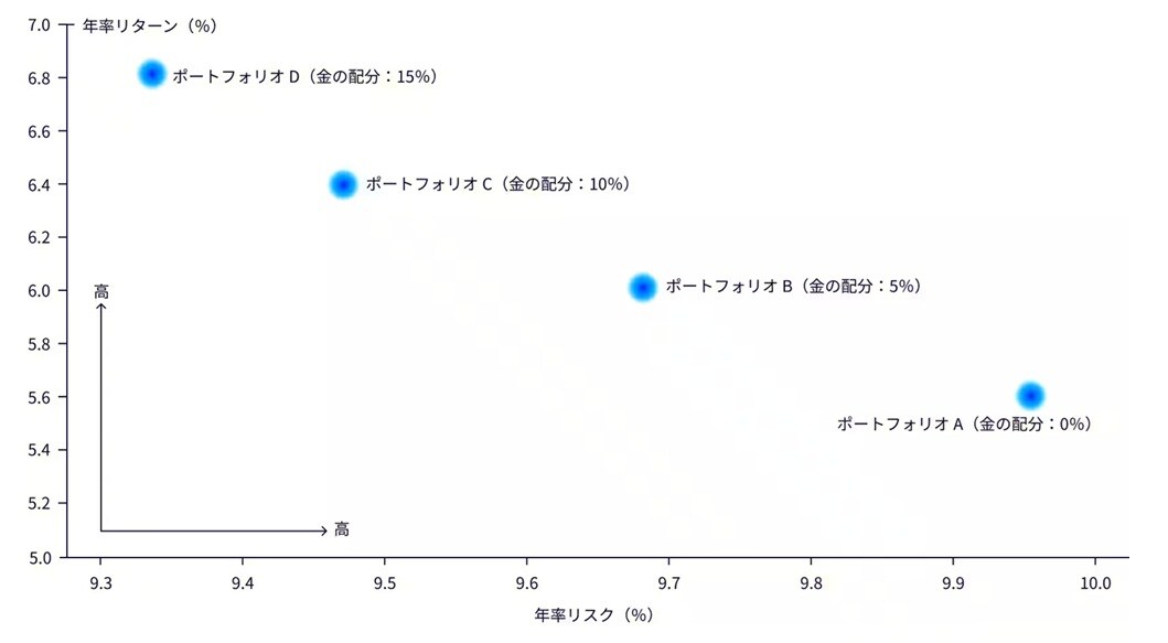 ポートフォリオ全体がボラティリティ(価格の上下への変動)によってさらされる年率リスクは金の比率が0%で9.95%、5%で9.68%、10%で9.47%、15%で9.33%と10%まで割り当てを増やすなかで、ポートフォリオのリスクが低減する傾向がみられます。