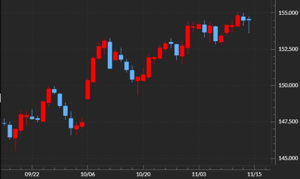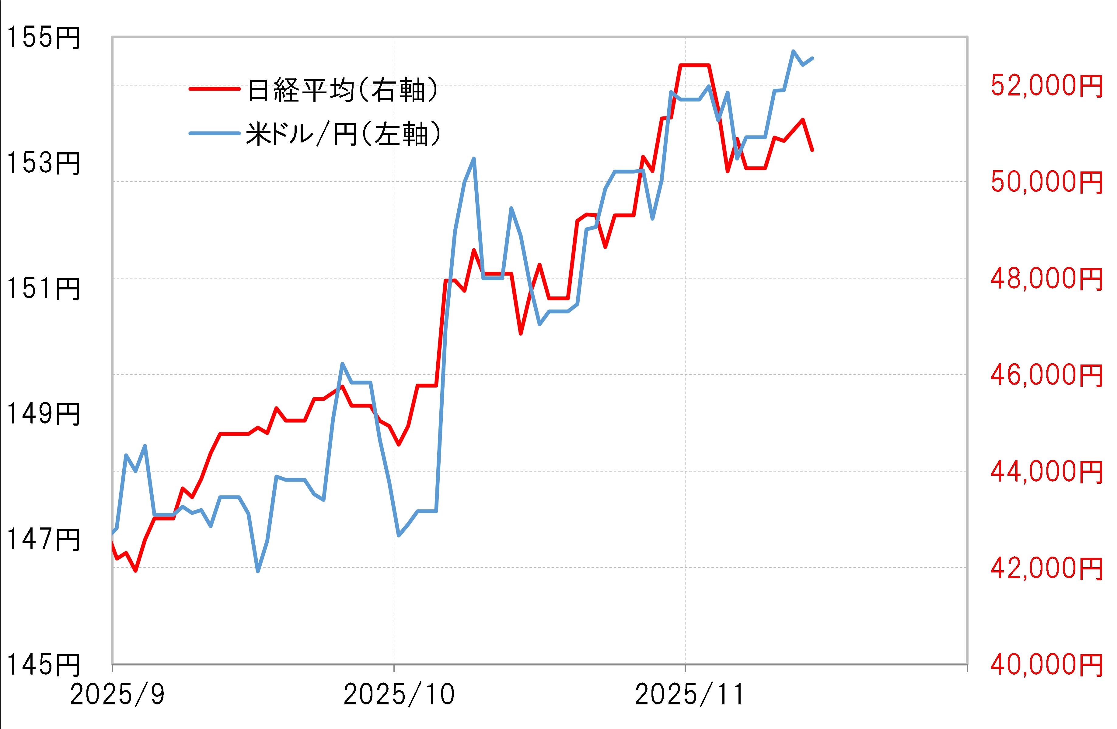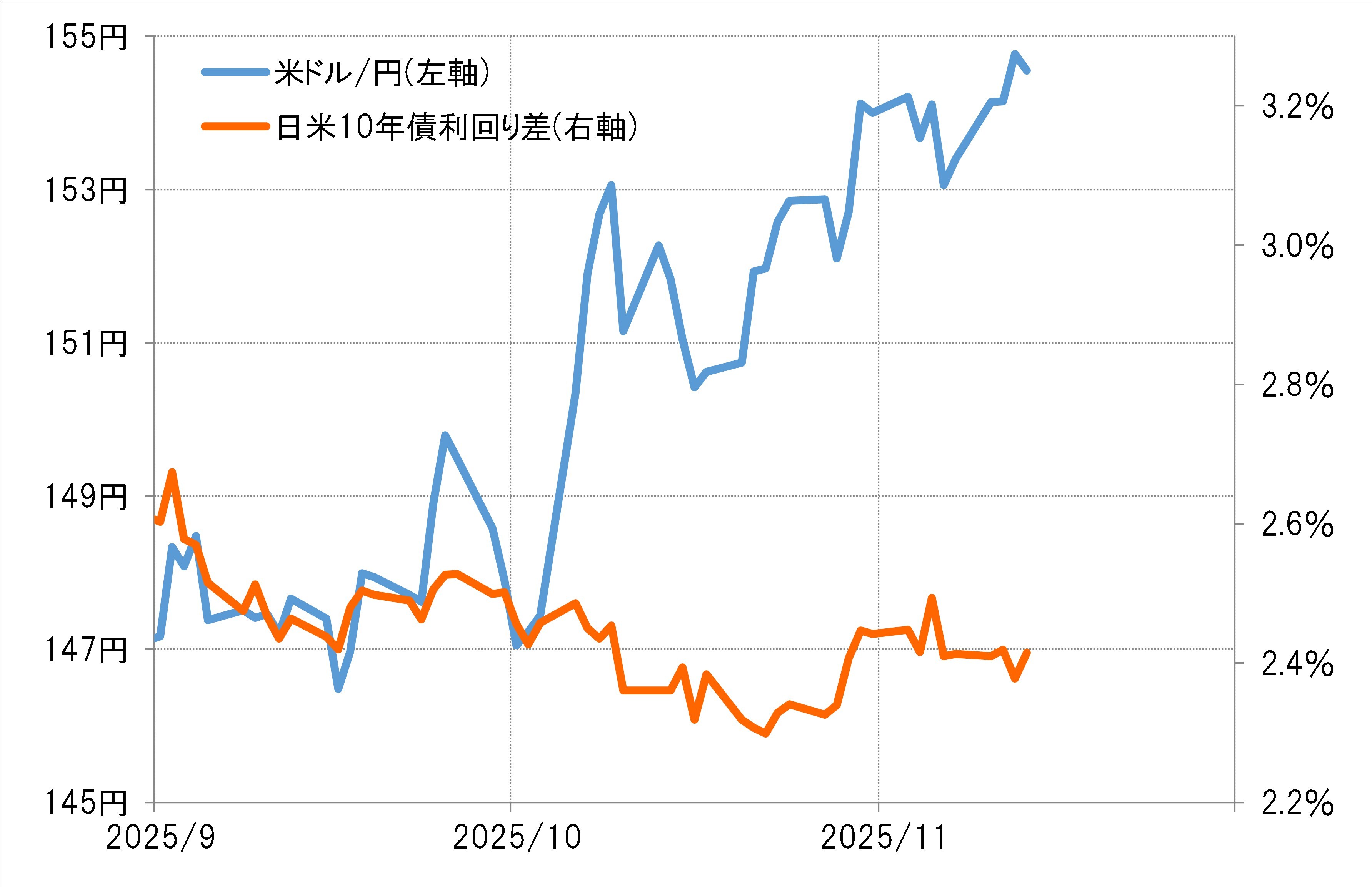 先週の米ドル/円はこの間の高値を更新し、一時155円台まで続伸しました(図表1参照)。米政府機能の一部停止、「シャットダウン」終了への期待からNYダウが高値を更新したことなどが好感され米ドル買い材料になったとされました。ただ実際にシャットダウンが終了したあとは、むしろ株価も大きく下落し、米ドル/円も週末は一時153円台半ばまで反落する場面もありました。