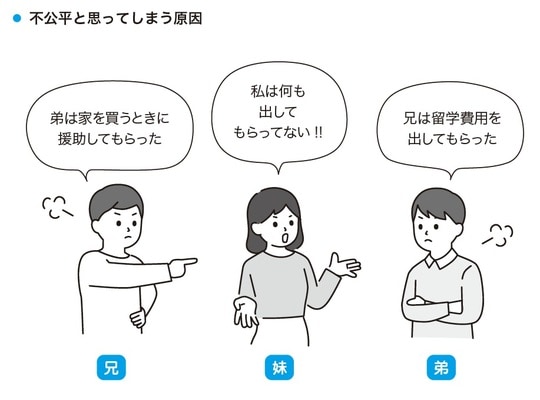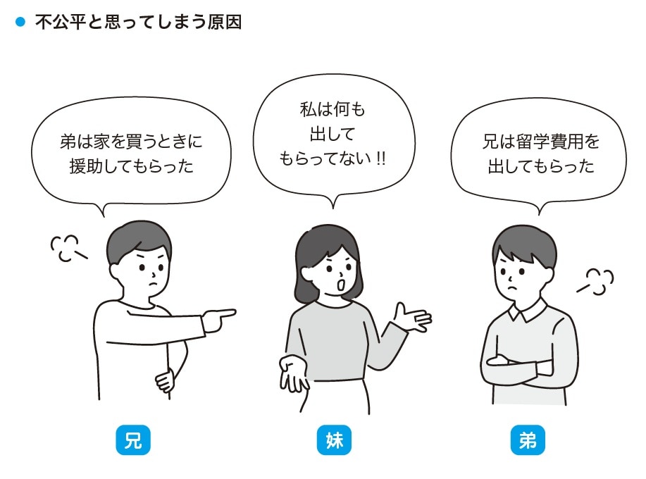 相続の場面でよく起こるのが、「生前にどれだけ支援を受けたか」に対する親族間の認識の違いによる不満です。「兄は留学費用を出してもらった」「妹は私立大学に通わせてもらった」「弟は家を買うときに援助してもらった」などどれも親の厚意として行われた支援のはずですが、いざ相続となると「自分には何もなかった」と不公平感が芽生えることがあります。