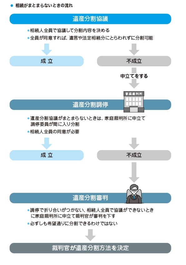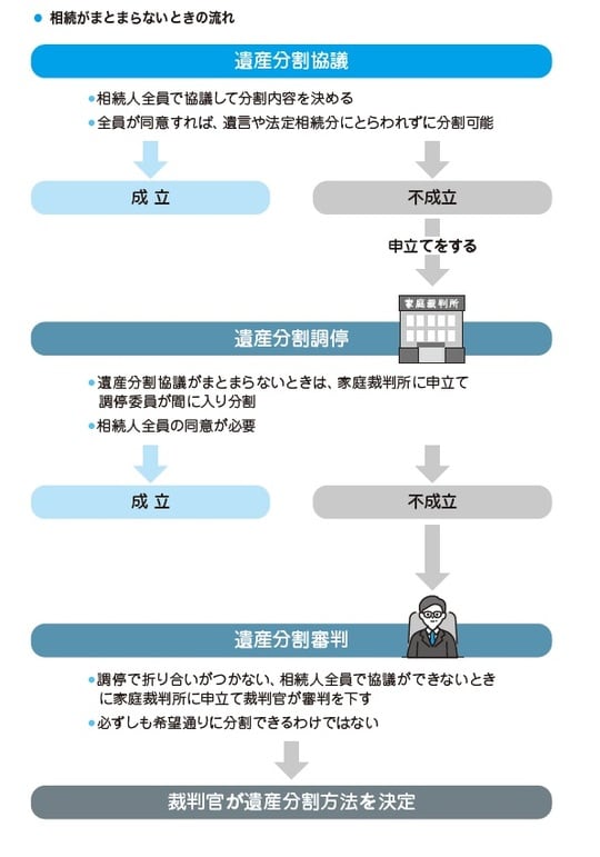 遺産分割協議は、相続人全員の合意がなければ成立しません。感情的な対立や、寄与分・特別受益を巡る意見の違いから話し合いがまとまらないと、最終的には裁判所に委ねざるを得なくなります。相続がまとまらないときの流れを簡単に整理しましょう。