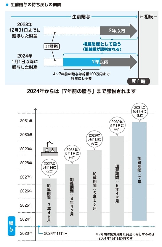 ただし2024年の改正により、亡くなる前7年以内(※1)の贈与は相続財産に加算されることになりました。そのため、亡くなる直前にまとめて贈与しても節税にはならず、高額の贈与では贈与税の税率が相続税より高く、かえって負担が増えることもあります。もっとも、「持ち戻し(※2)があるから意味がない」というわけではありません。