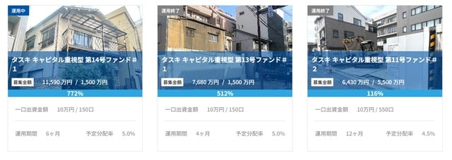 また、「TASUKI FUNDS」の運用期間は各商品によって異なりますが、長いもので1年程度、短いものだと4ヵ月程度となっており、運用が終了するとそれぞれのファンドは清算を行い、その清算内容によって償還や分配等が実施されます。