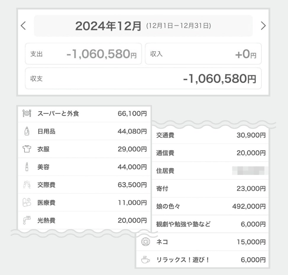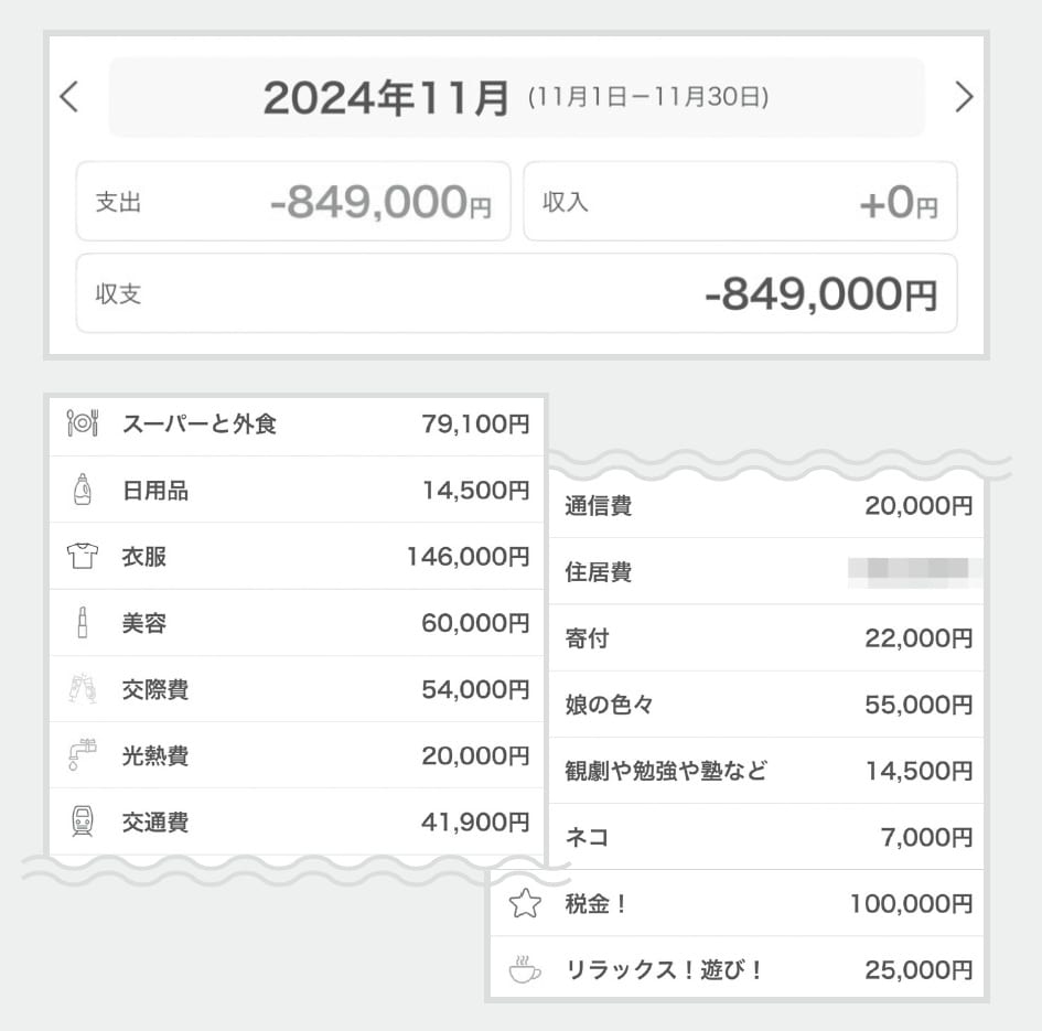 税金20万円が大きい。1月、お正月ということもあって食費や美容、交通費もいつもより多め。
