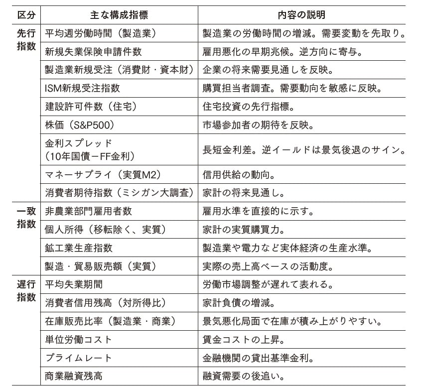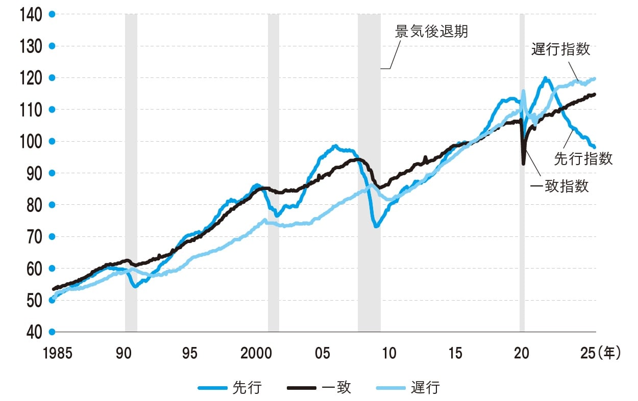 景気動向を示す代表的な指標には、景気先行指数・景気一致指数・景気遅行指数があります。先行指数は市場や企業のマインドを、一致指数は実際の生産や消費活動を、遅行指数は雇用や在庫といった後追い的な動きを反映します(図表6)。