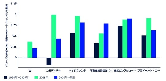 2008年以降、⾦と株式の相関が低下傾向にある⼀⽅で、他のオルタナティブ資産は株式との相関関係が強まっていることから、投資家のポートフォリオに対するリスク分散効果は薄れている可能性があります。