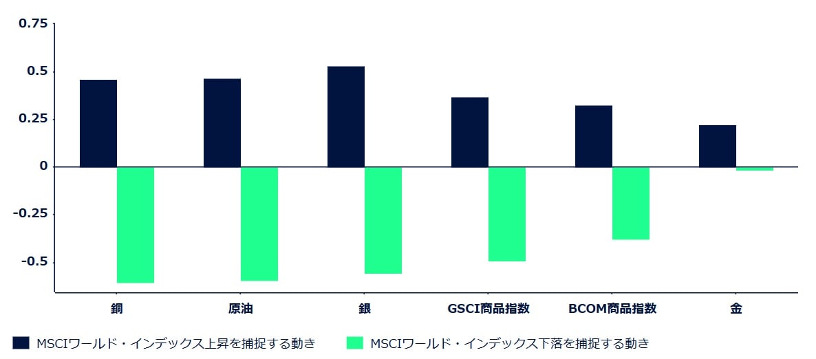 その理由は、これらのコモディティへの需要は景気循環に沿った消費の影響を受けやすいからです。つまり、グローバル株式や経済の上昇時にはそれを上回る可能性もあれば、株価や経済の下落時にはより⼤幅に下落する場合があることを意味します。