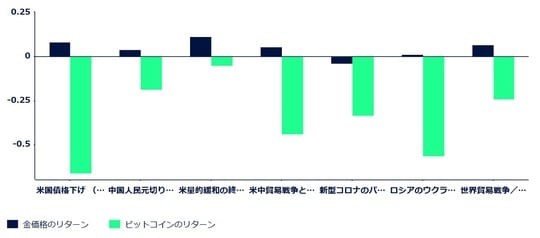 リスク分散効果とリスク調整後リターンに基づくと、特に市場下落局⾯において、ビットコインはこれまでの実績に基づくと⾦に匹敵するような利点は⾒当たりません(図表5)。