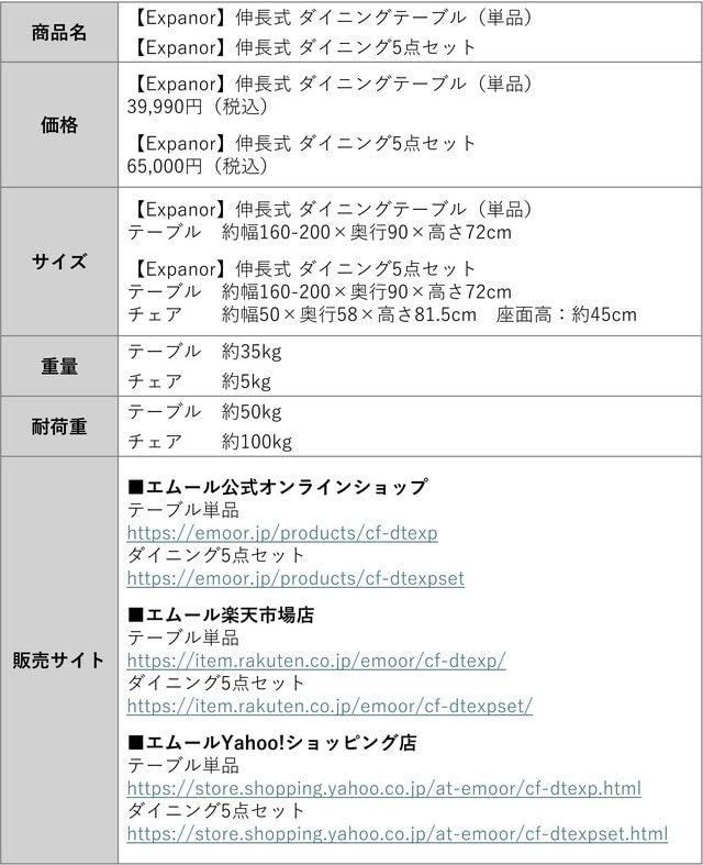 「寝る・座る・たたむ」に専門性をもつ健康家具ブランドEMOORを展開する株式会社エムール(東京都立川市:代表取締役 高橋 幸司氏/以下エムール)は、2025年11月24日より伸長式ダイニングテーブル『Expanor(以下、エクスパノール)』の販売を開始しました。さらに、エムール公式オンラインショップでは新商品も対象となるブラックフライデー限定企画を2025年11月28日23時59分まで開催します。以下、PR TIMESより。