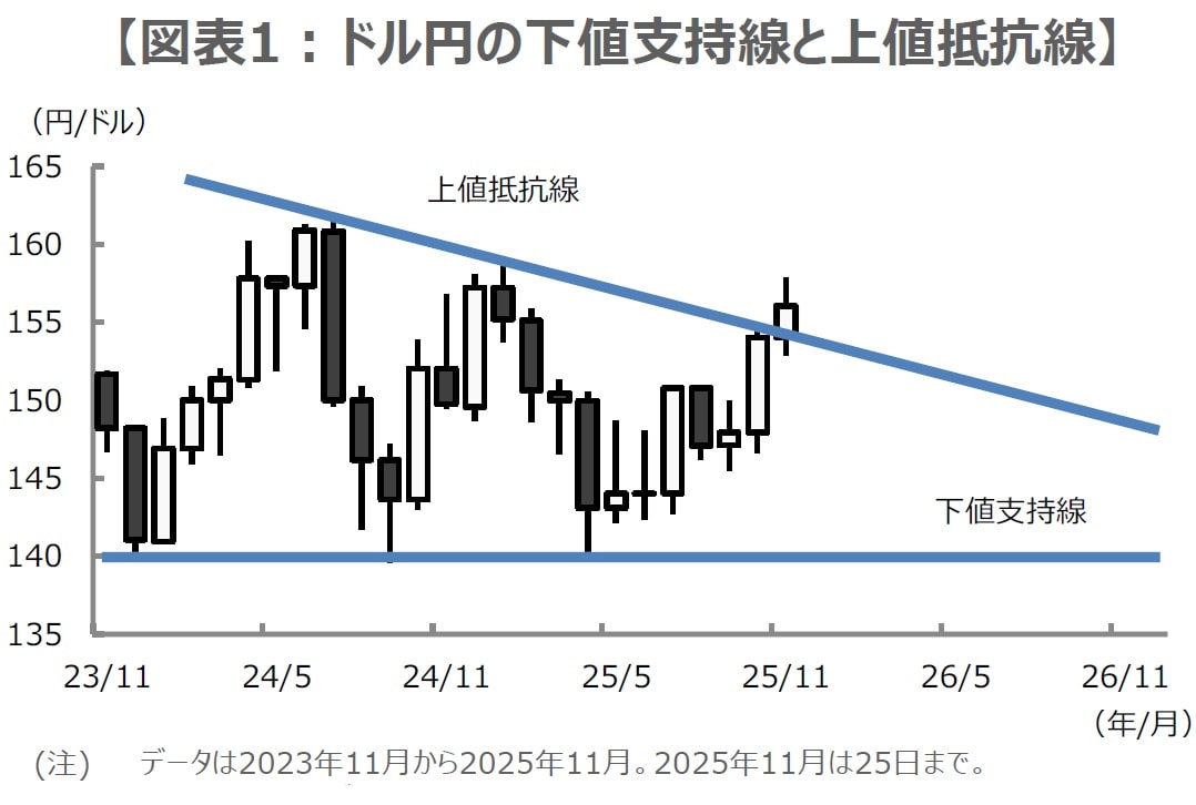 ドル円は、2023年12月28日安値(取引時間中、以下同じ)の140円25銭水準と、2024年9月16日安値の139円58銭水準、そして2025年4月22日安値の139円89銭水準を結んだ、おおよそ140円のラインが、ドルの下値支持線となっています。一方、2024年7月3日高値の161円95銭水準と、2025年1月10日高値の158円87銭水準を結んだラインが、ドルの上値抵抗線となっています(図表1)。