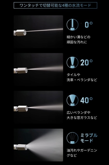 水流モードは4種類あり、頑固な汚れを洗い落としたいときに使う0°モードから高圧洗浄では洗えなかった傷つきやすいものを洗えるミラブルモードを搭載。水流の流量や圧力も本体のコントロールパネルで調整可能。(4段階あり)