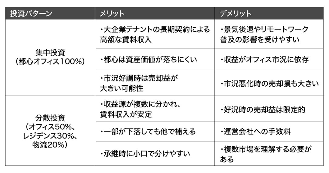 さらに、集中投資は地域の人口動態や経済状況の変化によって需要が減少する「地域リスク」や、住宅だけに投資すれば人口減少の影響を受けやすくなり、商業施設だけに投資すれば消費動向やインバウンド需要の変化に左右されやすくなるといったような「用途リスク」も抱えます。