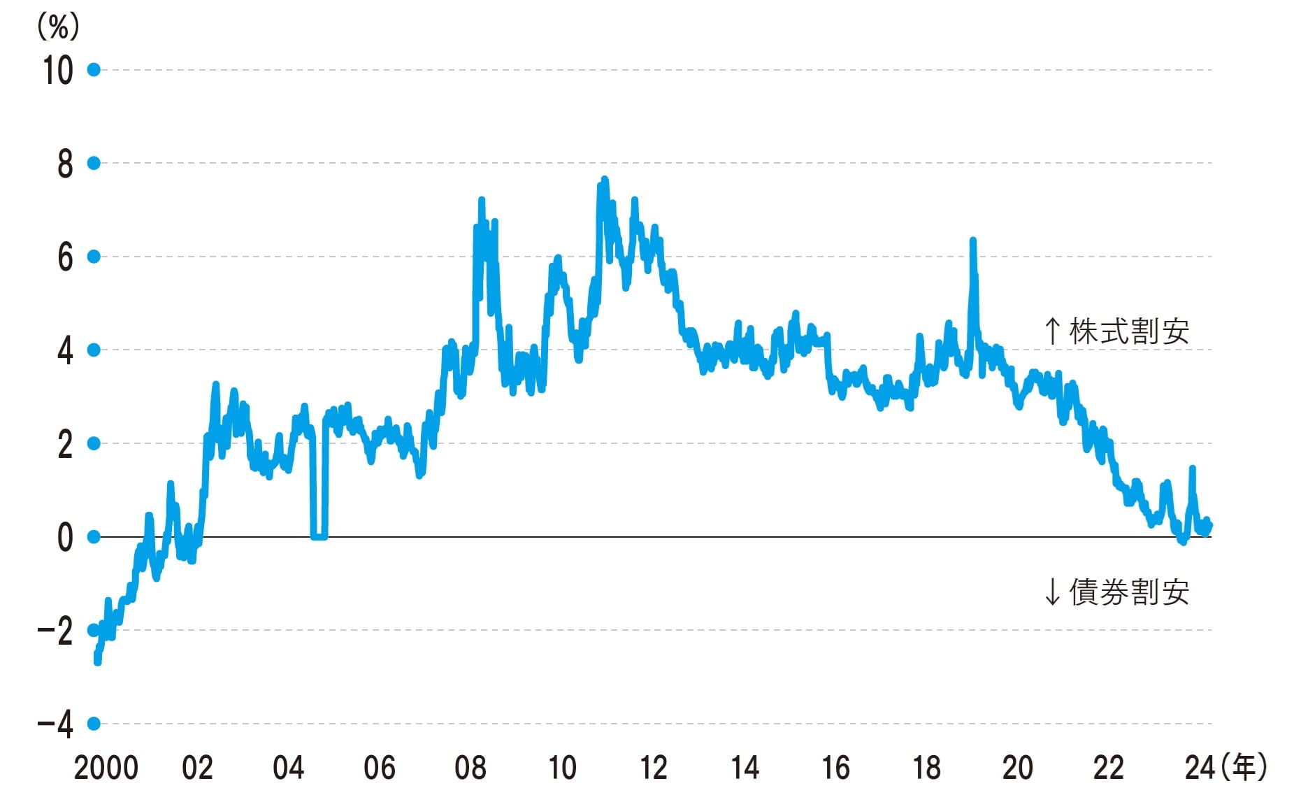 また、株式益利回り(E/P)と10年金利との差、いわゆる株式リスクプレミアム(ERP)が縮小しており、株式の相対的な妙味は低下しています(図表2)。