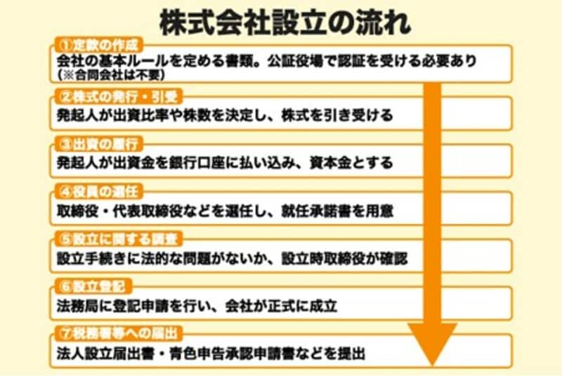こうした設立の手続きを弁護士や司法書士(登記のみ)、行政書士(定款認証のみ)に依頼する場合には、少なくとも5万円以上の報酬が別途必要です。なお、合同会社を設立する場合には定款認証が不要であるほか、登録免許税も最低6万円と株式会社よりも安価に済む可能性があります。