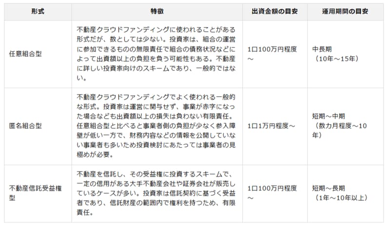どれも不動産小口化商品ですが、商品によって運営への関与や責任範囲、運用期間など細部に違いがあります。また、投資家の権利については、任意組合型や匿名組合型の場合は組合の出資持分を持つことが多いものの、中には不動産自体の所有権を一部持つものもあり、商品によっても異なる場合があるため、投資を検討する際には事前の確認が必要です。しかし、いずれも不動産を直接購入する現物不動産投資に比べると、少額で始めやすいという点は共通しています。