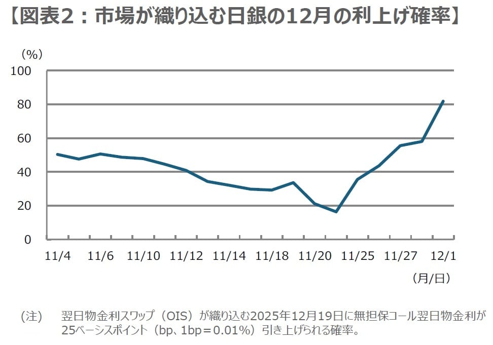 12月1日の国内市場では、12月の利上げの織り込みが進み(図表2)、各期間の国債利回りが上昇し、ドル安・円高が進行、日経平均株価は下落しました。ただ、日銀の利上げは、政策金利を緩和的な水準からゆっくりと中立水準へ戻すことを念頭に行っていると考えられ、長期的にみれば、国内経済や金融市場にはむしろ好ましいと思われます。そのため12月の利上げ織り込みに起因する昨日のような国内市場の反応は一時的なものとみています。