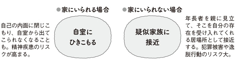 もうひとつのパターンは、家庭の外部に存在する「疑似家族」への接近です。子どもは自分が家族に受け入れられないと感じると、家を出て「疑似家族」に走ります。かつては非行集団や反社会的勢力が受け皿になっていました。しかし、時代とともにこうした組織は地下化しています。SNSなどを通じて巧妙な手口で、女子は性犯罪に、男子は組織犯罪に巻き込まれるリスクが高まっています。