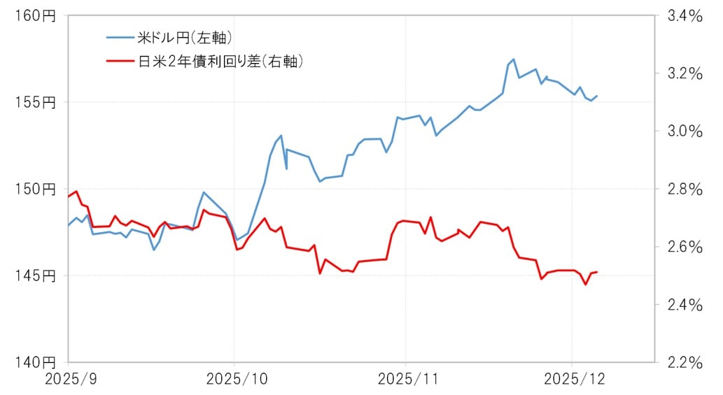 ただし、11月下旬にかけて米ドル高・円安が進み157円まで上昇した局面では、必ずしも日米金利差が拡大していたわけではありませんでした。では、なぜここに来て、米ドル/円が日米金利差の縮小に敏感に反応し、反落する展開となったのでしょうか。
