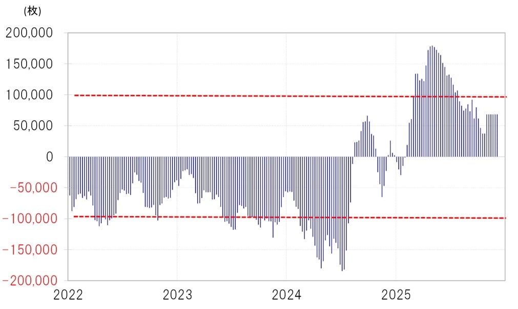 代表的な投機筋のポジション・データであるCFTC(米商品先物取引委員会)の統計は、いわゆる「シャットダウン」の影響で更新が遅れており、まだ10月末時点の結果にとどまっています。この時点では円が6.8万枚の買い越し(米ドル売り越し)となっていました(図表4参照)。