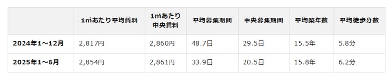 2024年から2025年にかけての変化を見ると、賃料水準は1㎡あたり平均2,817円から2,854円と、1.3%の微増となっています。中央値は2,860円から2,861円で横ばいです。