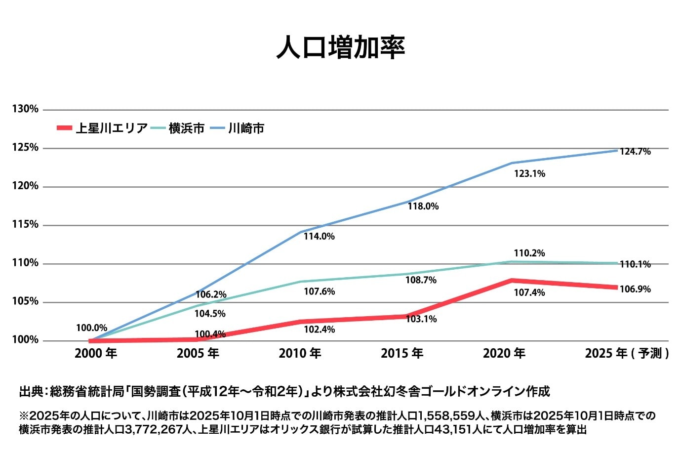 以下のグラフは、2000年を基準とした上星川エリア・横浜市・川崎市の人口増加率を示したものです。