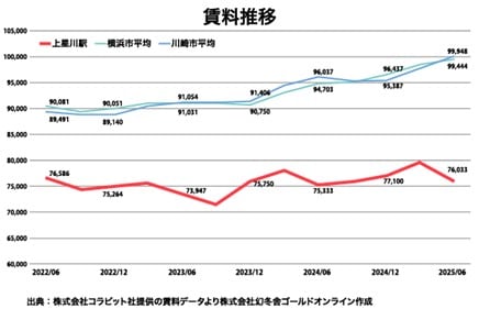 横浜市・川崎市はいずれも右肩上がりで、2020年12月~2025年6月の上昇幅はおおむね15~20%となっています。一方、上星川駅はおおむね7万5,000円前後で推移しており、横浜市平均に対しては常に1~2万円程度の割安が続いています。
