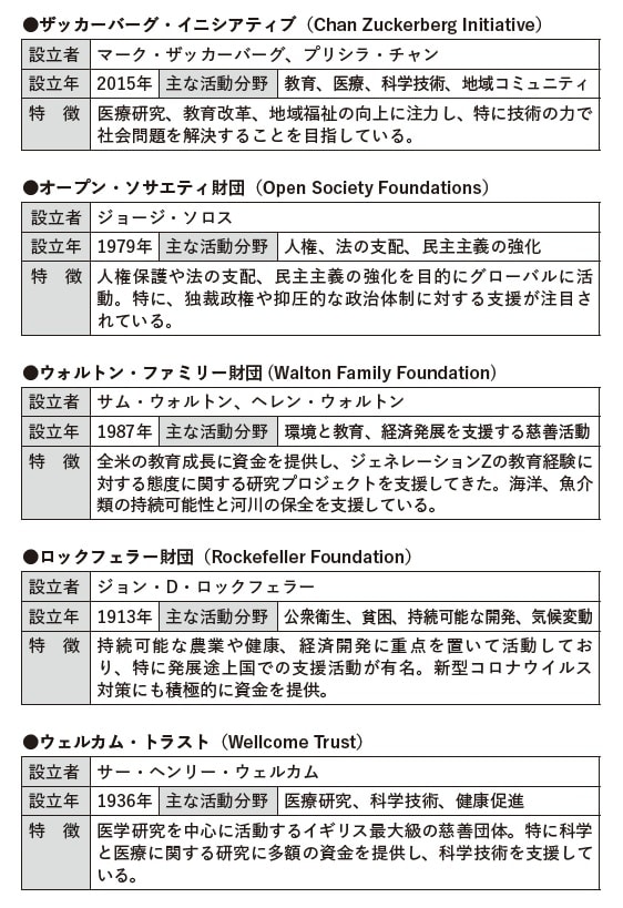 下記の表のように富裕層が出資者である財団が国内外に存在します。たとえば、ファーストリテイリング創業者・柳井正氏が設立した公益財団法人柳井正財団は、経済事情などにかかわらず、有望な人材が世界トップレベルの教育機会を得られるよう支援しています。その一環として、2017年より、アメリカとイギリスの大学に進学する学生に68億円もの給付型奨学金を支給しており、2024年9月までに、実に272人の奨学生を送り出してきました。
