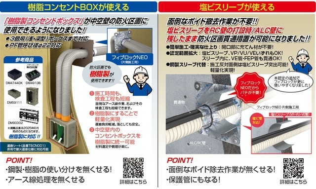 一般的には区画貫通部の開口部はパテで埋める工程が必要で、パテ埋めの工程に手間と時間がかかるうえ、確実な施工には高い技術を必要とします。また、表面だけでなく奥まできちんとパテが充填されているかを確認することが難しく、施工完了時の状態の目視検査が困難という問題もあったことから、2021年には①簡単・確実施工②目視・確実検査の2つをコンセプトに、電気用途(PF管・ケーブル貫通用)向けには、パテ埋め作業不要の「フィブロックNEO」を新たに開発、発売を開始しました。