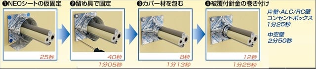 「フィブロックNEO」シートを留め具で固定し、カバー材を被覆付き針金で巻くだけ!