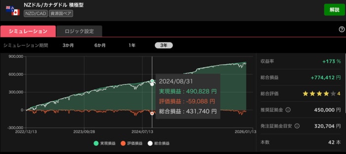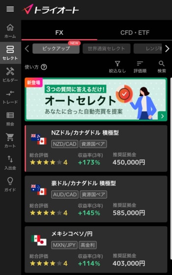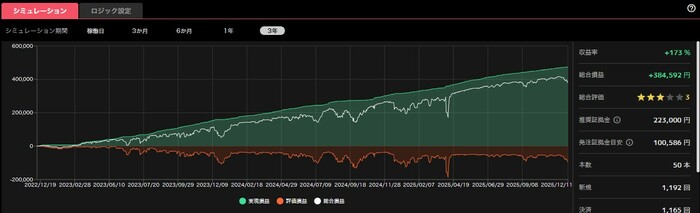 シミュレーションの「実際にその設定だったら、どれくらいの利益が出たか」という収益性から選ぶだけで運用を始められる機能です。