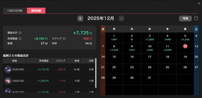| 2025年12月 | 7,725円 | 8,105円 | -380円 | 27回 | 14回 |