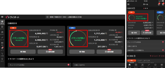 トライオートFXには、このリスク管理を直感的にしてくれる「バランスメーター」という機能があります。