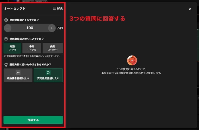 しかし、オートセレクトなら専門知識がなくても、3つの質問に答えるだけで、プロのような運用設定が作れます。